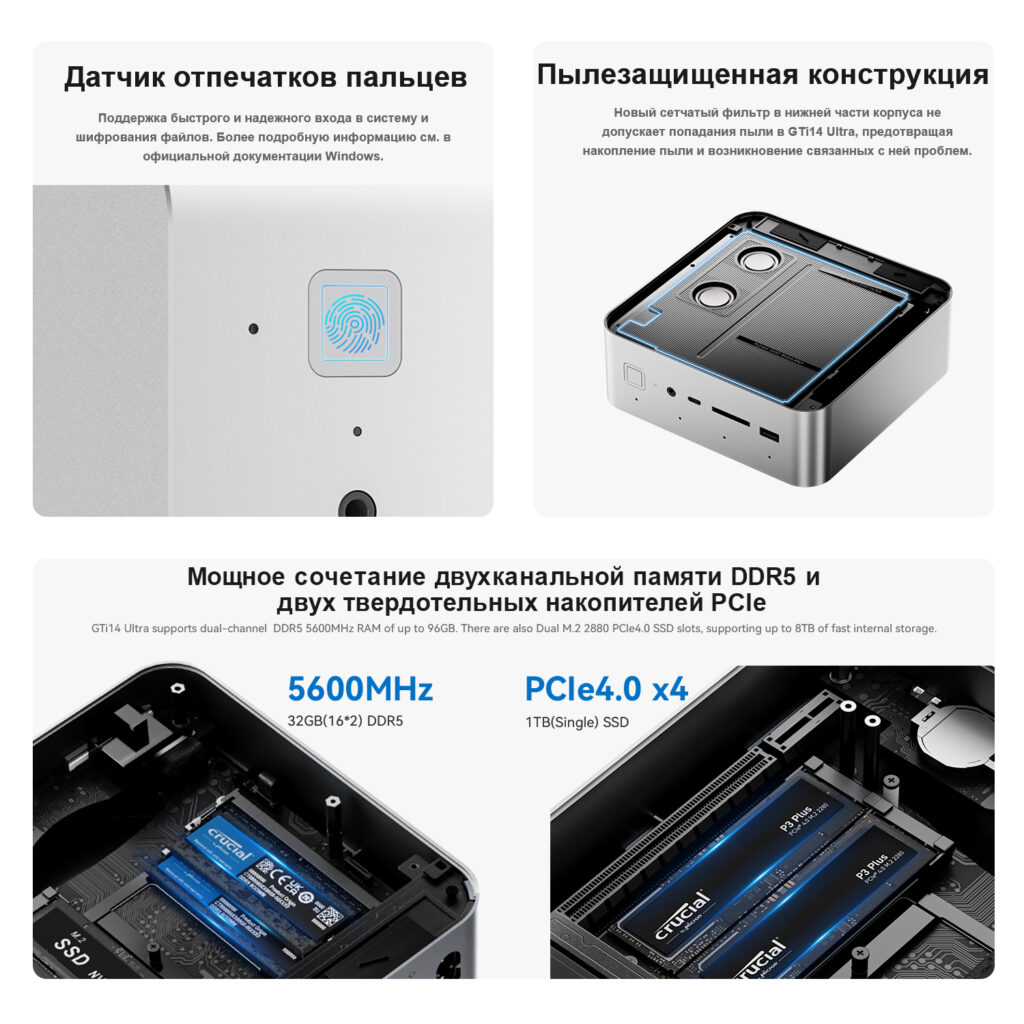 Мини-ПК Beelink GTi14 — это профессиональный настольный мини-ПК, оборудованный передовым процессором Intel Core Ultra 9 185H с 16 ядрами и 22 потоками, работающим на частоте до 5,1 ГГц. Beelink GTi14 использует встроенную графику Intel Arc Graphics с частотой до 2350 МГц, что обеспечивает плавное воспроизведение видео в 4K UHD и поддержку современных игр на высоких настройках. Объём оперативной памяти DDR5 составляет 32 ГБ, позволяя запускать ресурсоёмкие приложения и виртуальные машины без снижения производительности. Для быстрого доступа к данным используется NVMe SSD формата M.2 объёмом 1 ТБ, обеспечивающий мгновенную загрузку системы и программ.