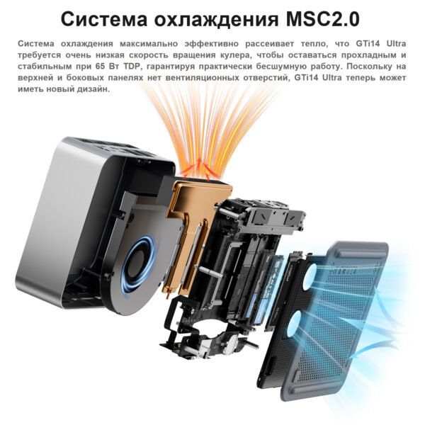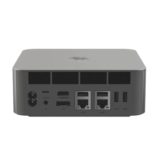 Мини-ПК оснащён двумя портами 2.5G LAN для проводного подключения и новейним двухдиапазонным Wi-Fi 7 для беспроводной сети. В набор разъёмов входят пять портов USB 3.2, два USB 2.0, USB-C с поддержкой USB 3.2, Thunderbolt 4, HDMI 2.1, DisplayPort 1.4a, слот для SD-карт и сканер отпечатков пальцев. Звуковой выход реализован двумя 3,5 мм аудиоразъёмами для подключения наушников и гарнитур. Алюминиевый корпус размером 158×158×55 мм доступен в цветах «серебристый» и «серый металлик», сочетая прочность и стиль. Система охлаждения с тепловыми трубками и тихими вентиляторами поддерживает оптимальную температуру при длительных нагрузках и минимальный уровень шума. В комплект входят блок питания, кабель HDMI и кабель питания для мгновенного старта работы. Отсутствие оптического привода снижает вес и энергопотребление устройства. Габариты и поддержка VESA-крепления позволяют скрыть мини-ПК за монитором, экономя место на столе. Bluetooth 5.4 обеспечивает бесперебойную связь с периферией.